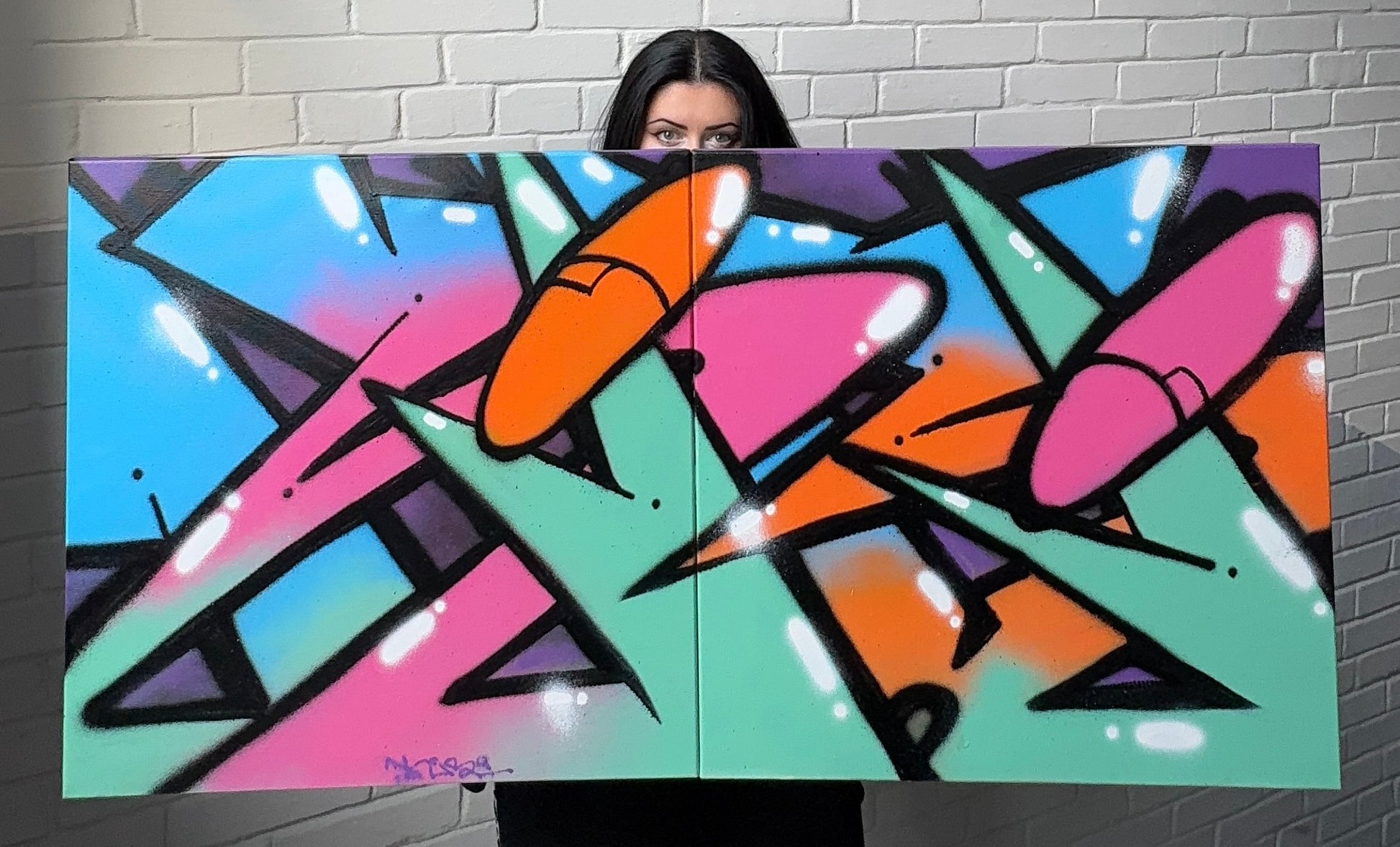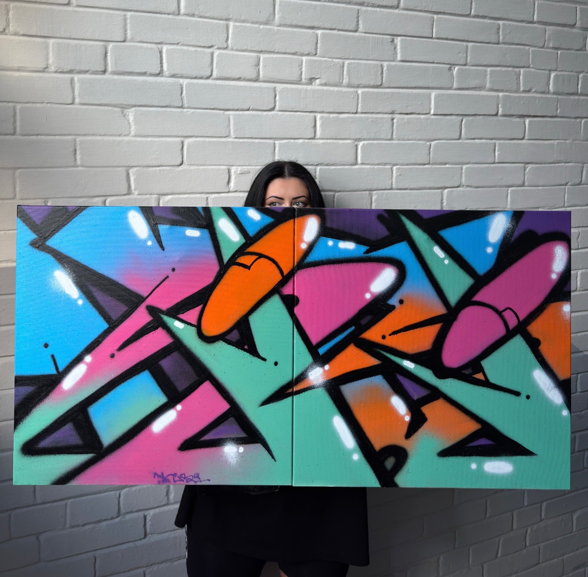 In this piece, the artist - a graffiti girl who paints with both fire and finesse - merges raw energy with carefully honed control. Vivid cyan skies crash into cotton candy pinks, while blades of mint green slice through space like declarations of independence.